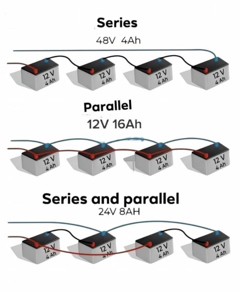 Batteries can be hooked up in Parallel, Series or direct. You can also combine Parallel and Series to get additional benefits. Refer to the figure below to see the different ways you can hook up a set of batteries and how it changes the Voltage and Amp Hours.